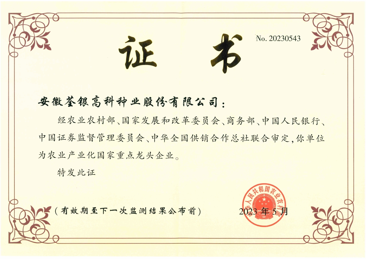 安徽荃銀高科種業(yè)股份有限公司是一家“以種業(yè)為核心、農(nóng)業(yè)服務為延伸、探索和創(chuàng)新農(nóng)業(yè)多元化發(fā)展”的現(xiàn)代高科技種業(yè)上市公司,證券代碼:300087。公司注冊資金9.47億元,系“中國種業(yè)領軍企業(yè)、農(nóng)業(yè)產(chǎn)業(yè)化國家重點龍頭企業(yè)、國家高新技術企業(yè)、農(nóng)業(yè)部首批農(nóng)作物種子育繁推一體化企業(yè)、中國種業(yè)信用明星企業(yè)"。在國內(nèi)控股子公司20多家,在國外設立分支機構4家,良種銷售至全國20多個省(市、區(qū)),出口覆蓋20多個國家與地區(qū),種業(yè)綜合實力、雜交水稻研發(fā)、推廣及海外業(yè)務規(guī)模均居全國種子企業(yè)前2位。
